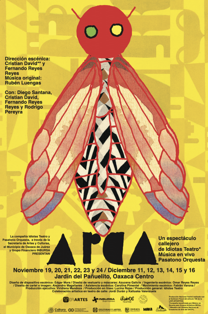 Inspirada en la poética de la chicharra —insecto central en la cosmovisión mixteca, asociado a la lluvia, la fertilidad y los ciclos de la vida—, ARCA convierte el paisaje urbano en un pasacalle onírico donde música, teatro físico, máscaras, objetos y escultura se entrelazan para dialogar con la memoria colectiva y la comunidad.