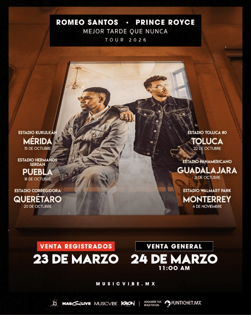 El género que ha hecho bailar al mundo entero vivirá un momento sin precedentes en territorio mexicano. Este otoño, la nostalgia y el romance se fusionarán con el anuncio oficial del “Mejor Tarde Que Nunca Tour 2026”, la gira que reunirá a los dos pilares más grandes de la bachata moderna: Romeo Santos y Prince Royce. En Thunder analizamos el impacto de esta alianza que junta a dos generaciones de artistas que, tras años de dominar las listas de popularidad por separado, finalmente han decidido compartir el escenario en una serie de conciertos que ya se perfilan como los eventos latinos más importantes del año.