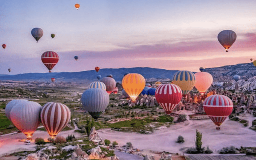 Decenas de globos aerostáticos se elevan con los primeros rayos del sol, tiñendo el cielo de tonos rosados y dorados mientras iluminan las formaciones rocosas milenarias. El silencio del paisaje, la altura y la vista panorámica convierten esta experiencia en una de las más románticas que se pueden vivir en Turquía.