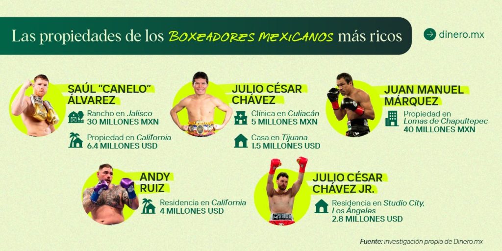 Canelo Álvarez es el boxeador mexicano con mayor fortuna estimada. Forbes calculó su patrimonio en 275 millones de dólares y destaca que ha obtenido casi 600 millones de dólares en ganancias de carrera antes de impuestos. Su cartera inmobiliaria incluye: