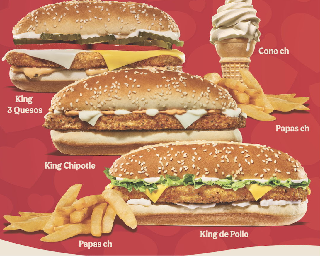 - King de Pollo 3 Quesos: una combinación intensa que potencia la jugosidad del pollo con una mezcla cremosa y contundente.