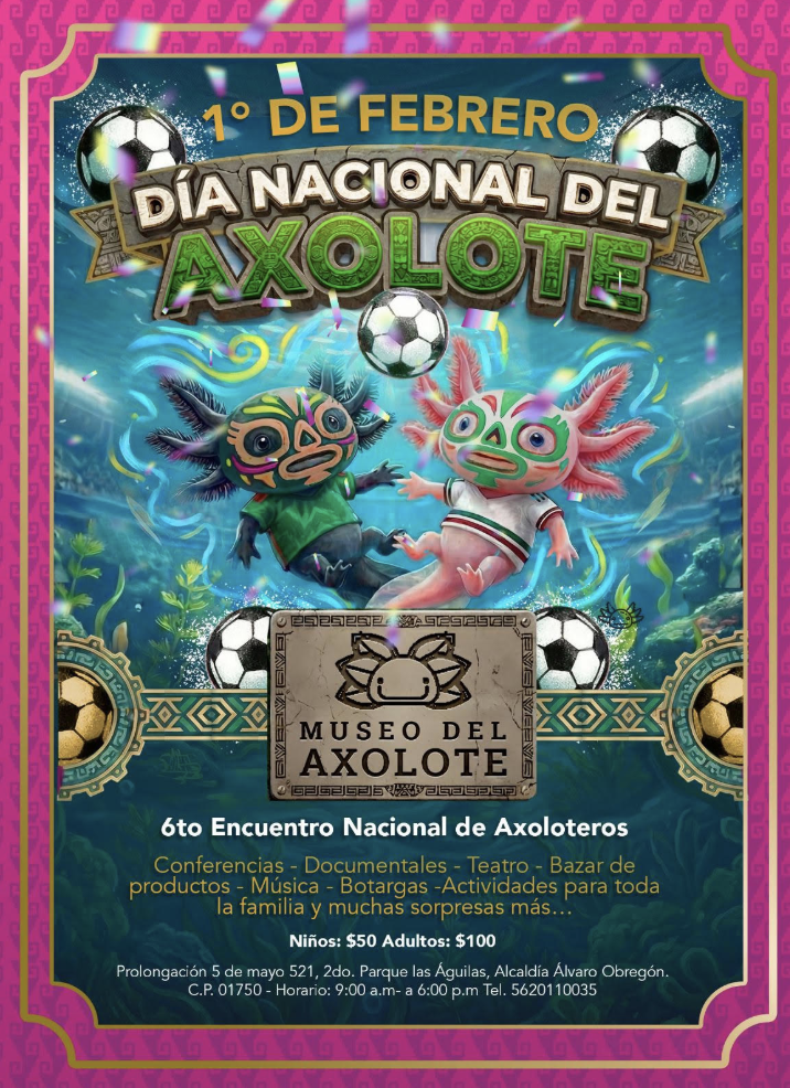 La cita es el 1 de febrero, de 9:00 a.m. a 6:00 p.m., en el Museo del Axolote, ubicado en Av. Prolongación 5 de mayo #521, 2º Parque de las Águilas, Alcaldía Álvaro Obregón.