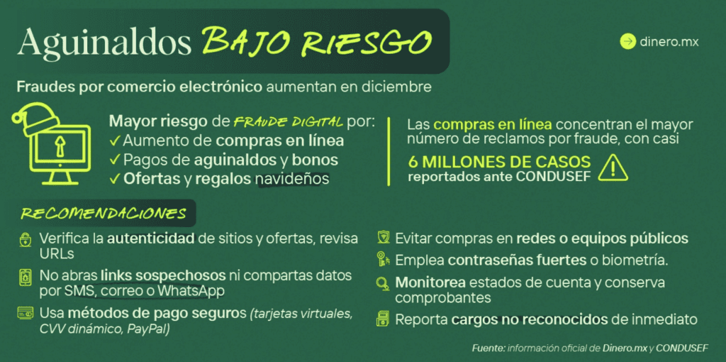 Diciembre se ha consolidado como el mes más activo para los fraudes digitales relacionados con compras en línea. Alejandro Sena, director de Dinero.mx, señala que “la combinación de la entrega de aguinaldos, bonos de fin de año, ofertas, regalos navideños, vacaciones y altas ventas en comercio electrónico, crean el escenario ideal para que los estafadores cibernéticos puedan cometer los fraudes con mayor frecuencia durante este mes.”