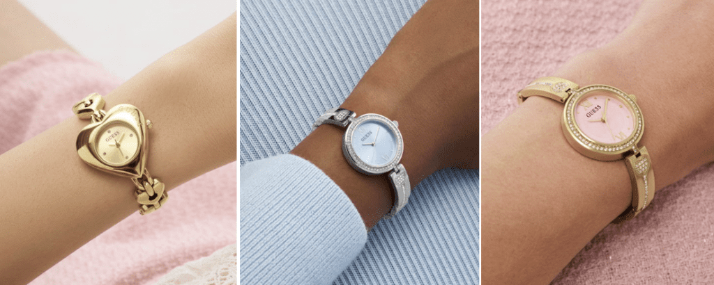 Los nuevos modelos de GUESS Watches encuentran el equilibrio perfecto entre diseño y emoción. Con acabados metálicos, siluetas delicadas y una estética que combina brillo con intención, estas piezas funcionan como pequeños símbolos del vínculo entre amigas. Uno de los relojes destaca por su carátula rosa claro con acabado sunray, acompañada de un bisel con cristales que capturan la luz con suavidad; el otro, más estructurado, se presenta en forma de corazón dorado pulido, ideal para llevar el amor —propio o compartido— con estilo y sin exageraciones.