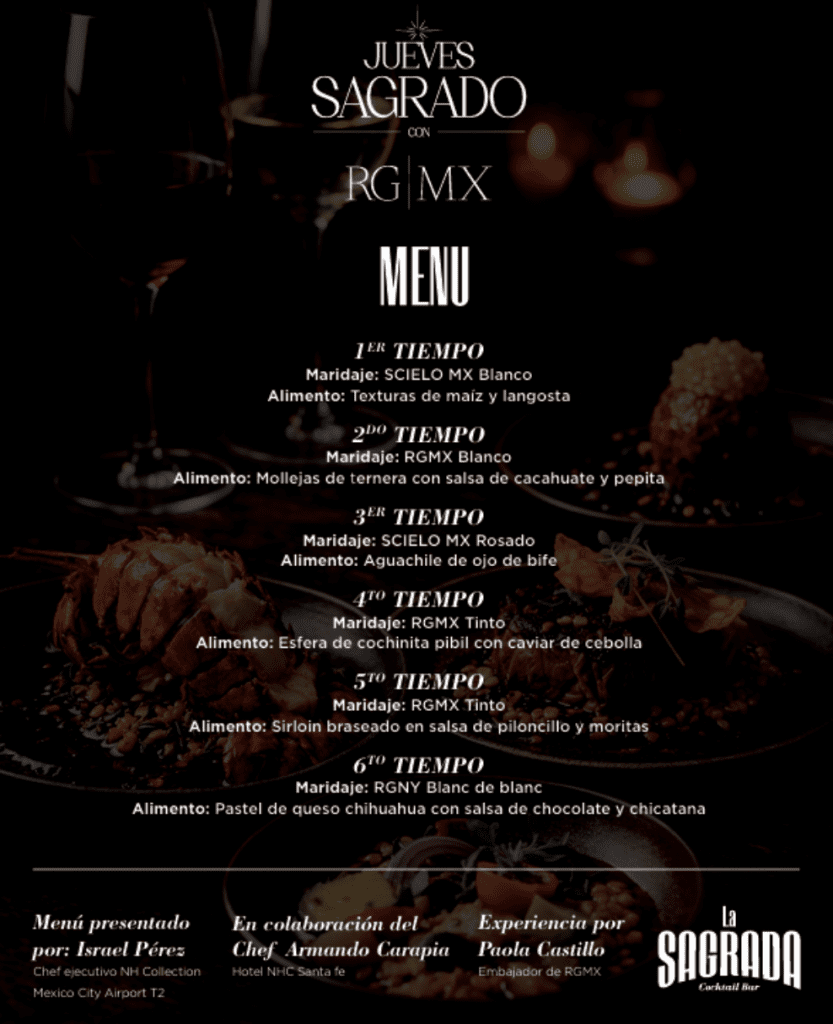Ubicado en la Terminal 2, el cocktail bar La Sagrada dentro del hotel NH Collection Airport T2 presenta una exclusiva cena maridaje de seis tiempos; en colaboración con los chefs Israel Pérez y Armando Carapia, esta experiencia armonizada con vinos de RGMX fusiona técnicas contemporáneas con ingredientes emblemáticos como la langosta, el caviar de cebolla y la chicatana.