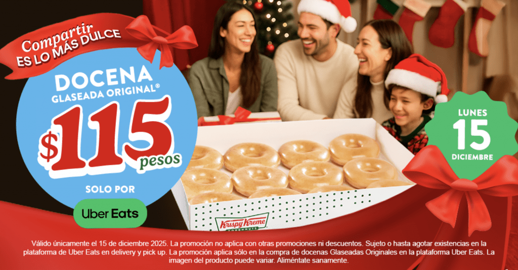 Hay promociones que se sienten como abrazo de invierno, y esta es una de ellas. Este 15 de diciembre, Krispy Kreme® México y Uber Eats se unen para lanzar una tentación imposible de ignorar: la clásica Docena de Donas Glaseadas Originales® estará disponible por solo $115 pesos, en una promo exclusiva para pedidos realizados a través de Uber Eats.