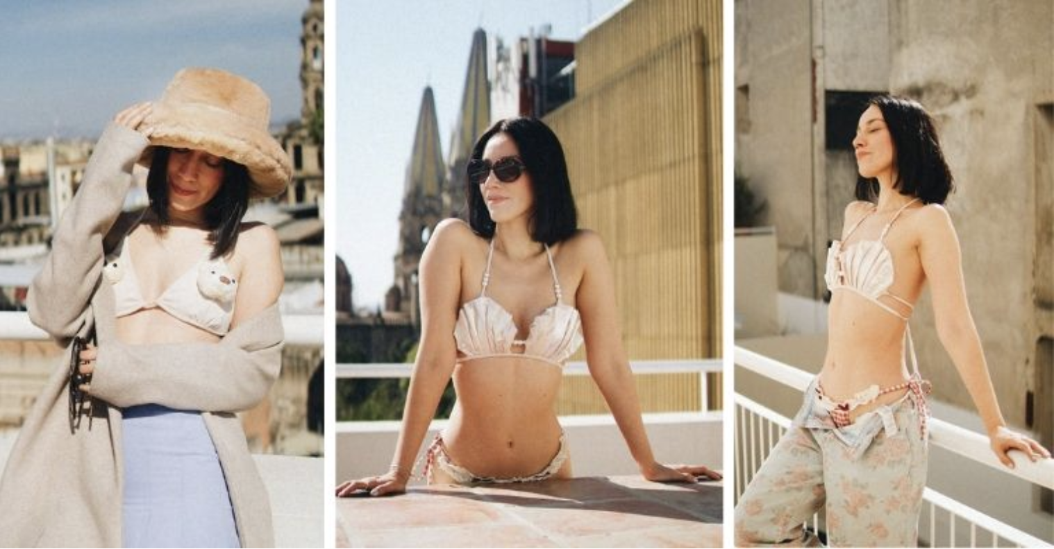 Las imágenes destacan por alejarse del típico styling de playa. Camacho apostó por trajes de baño con diseño experimental, como tops con pequeños peluches o piezas en forma de concha, combinados con pantalones oversize, abrigos, gorros y capas que rompen con la lógica tradicional del swimwear. El resultado: una narrativa visual que mezcla moda urbana, ironía y fuerza estética.