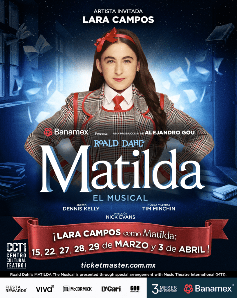 El teatro musical en México se prepara para un momento especial: Lara Campos interpretará a MATILDA en funciones seleccionadas del montaje producido por Alejandro Gou, uno de los nombres más sólidos de la industria teatral en el país.