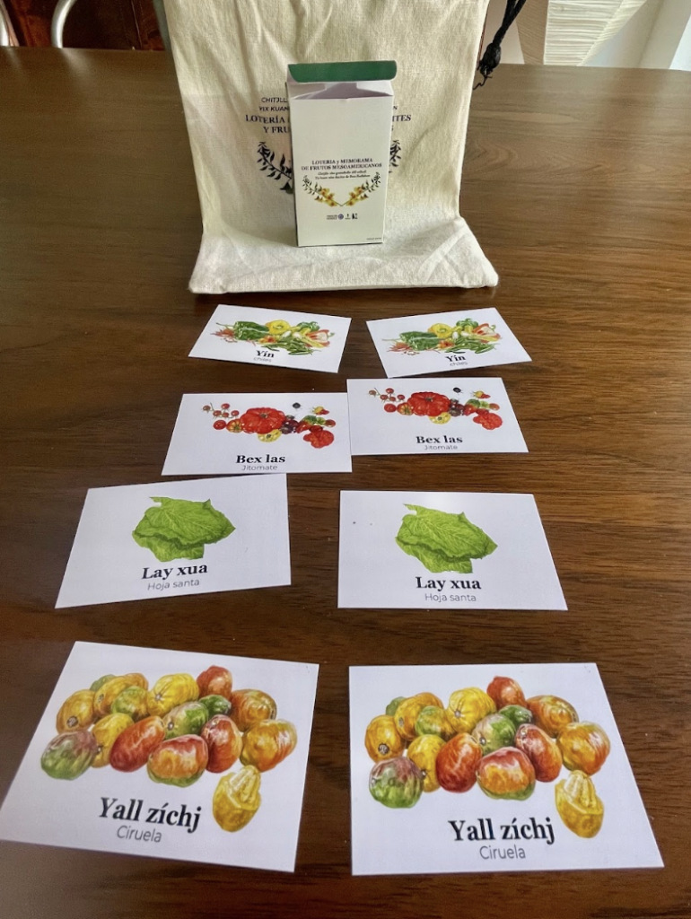 La Lotería y memorama de quelites y frutos mesoamericanos en zapoteco de Yalálag incluye 5 tablas de lotería, 27 tarjetas de lotería, una cajita con 27 pares de ilustraciones (54 tarjetas) y un morralito, pensados para que niñas, niños y personas adultas puedan jugar, repetir palabras, asociar imágenes y empezar a naturalizar la presencia del zapoteco en su vida diaria. Más que un simple souvenir, el set funciona como herramienta de revitalización lingüística y como recordatorio de que el idioma vive mientras se usa, se pronuncia y se disfruta.