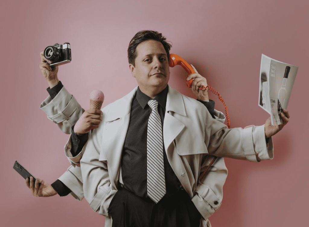 por un lado, el abuelo godín de cepa, feliz entre escritorios y horarios; por el otro, el galán de barrio, clásico conquistador a la antigua. De esa mezcla nace un Gutiérrez que sueña en grande, se cree un poco galán de telenovela y representa a ese compañero de trabajo que todos hemos tenido… o hemos sido.