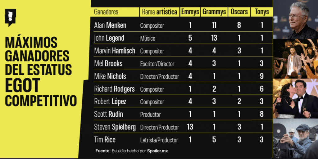 De acuerdo a Spoiler.mx, los máximos ganadores del EGOT competitivo representan la cima del reconocimiento artístico. Más que un simple acrónimo, el EGOT funciona como un termómetro de versatilidad y permanencia cultural. Figuras como Lopez, Menken, Legend o Spielberg no sólo han reunido los cuatro premios principales, sino que han acumulado otros galardones y honores que refuerzan su influencia. Sus trayectorias confirman que la excelencia en el entretenimiento contemporáneo rara vez se limita a una sola disciplina, florece cuando el talento logra cruzar fronteras creativas y redefinir lo que significa ser un artista completo.