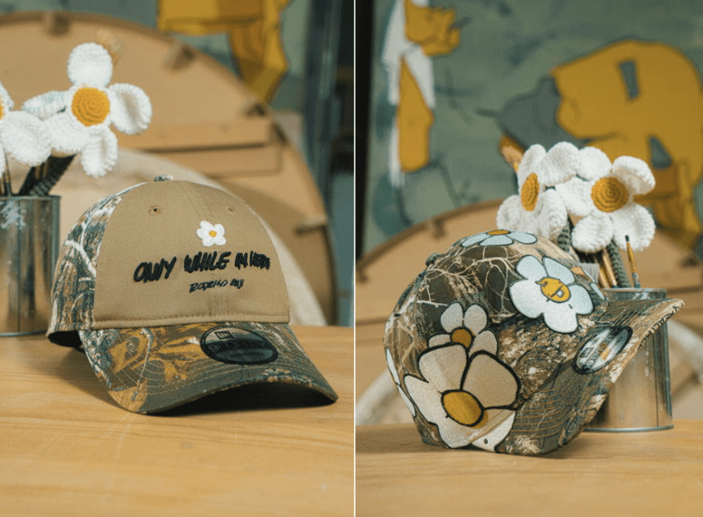 Por su parte, la 9FORTY combina Realtree® EDGE camo en visera y paneles laterales con una corona en tono light brown. Al frente destaca la frase “Only While I’m Here”, acompañada por una flor y el nombre del artista, reforzando el mensaje conceptual sobre permanencia, tránsito y lo efímero.