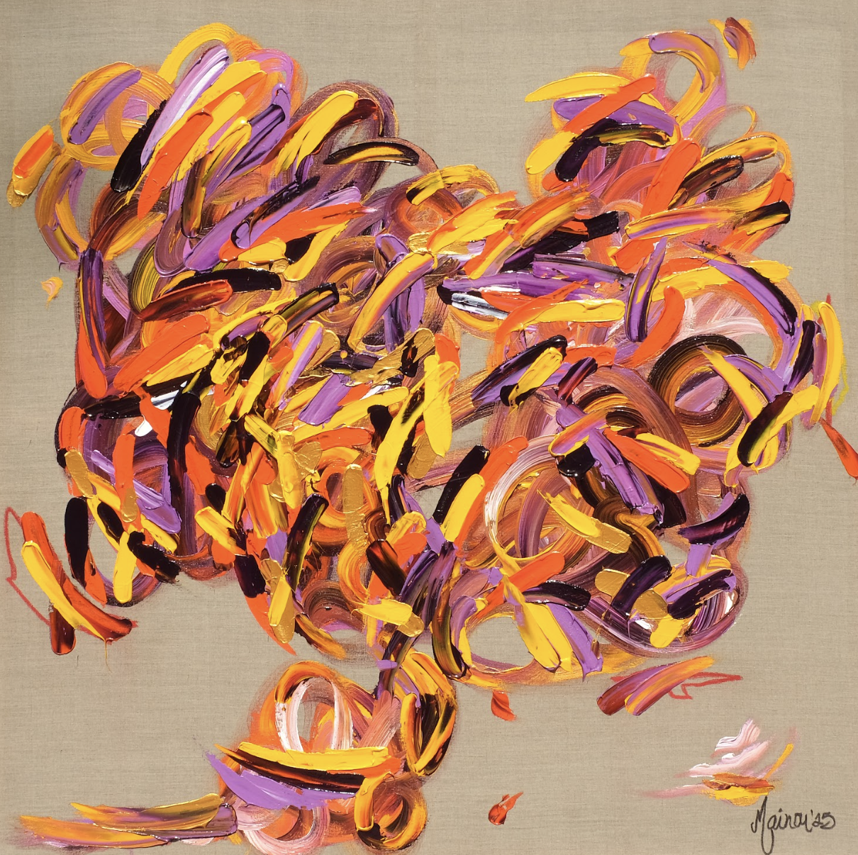 Tras una sólida formación en el diseño de joyería, Mainou ha trasladado la precisión del metal y las gemas a la libertad del lienzo. Su transición no es un cambio, sino una expansión. En sus piezas, el color no es solo pigmento, es una emoción que ya no cupo dentro de ella y que hoy, a través de acrílicos Hi-Flow y gestos cargados de vitalidad, encuentra su forma definitiva.