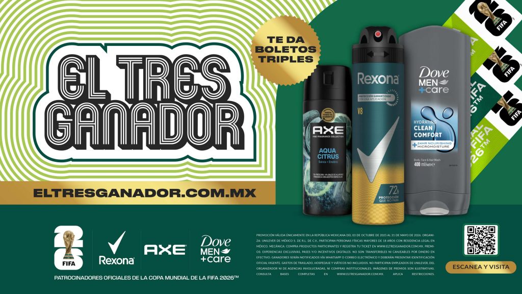 El futbol en México no se explica, se vive en la piel. Y ahora, con el regreso de la Copa Mundial de la FIFA 2026™ al país, esa emoción se multiplica por tres. Bajo ese mismo espíritu, Rexona, Axe y Dove —tres de las marcas de cuidado personal más queridas de Unilever— lanzan “El Tres Ganador”, una promoción que pone en juego 184 pases triples para partidos del Mundial en territorio mexicano, además de más de 3,000 premios adicionales.