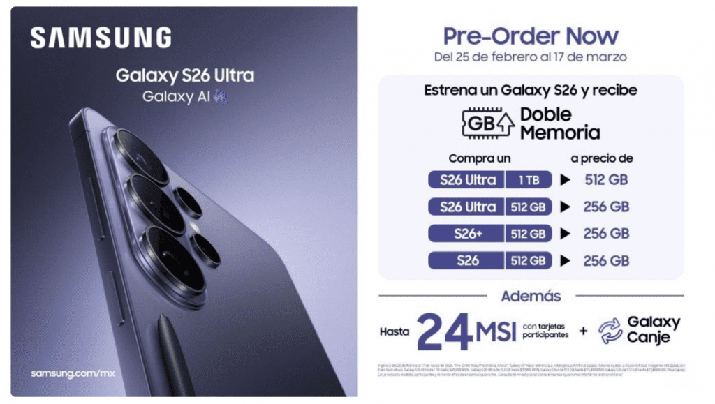 La preventa ya está disponible en Samsung.com/mx y continuará hasta el 17 de marzo. Durante este periodo, Samsung ofrece el doble de memoria gratis al estrenar tu nuevo S26. Aquí los detalles de precios: