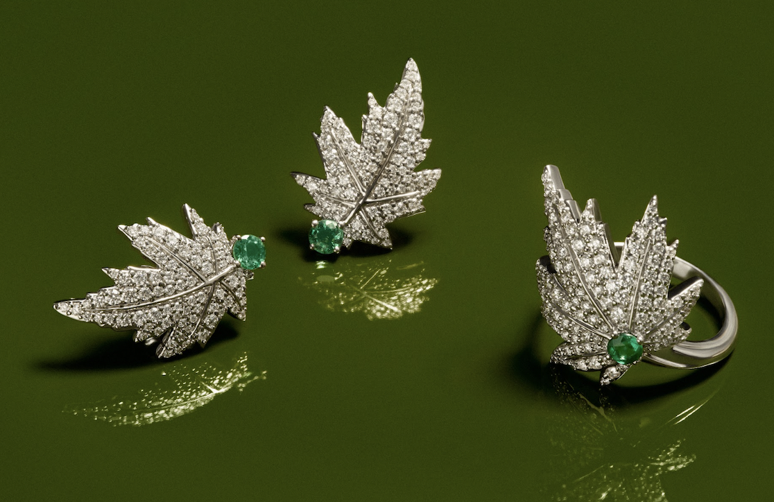 La colección incluye sortijas con hojas envolventes y piedras centrales que simbolizan el ciclo vital, pulseras y colgantes que celebran la renovación constante de la naturaleza, pendientes articulados en cascada, broches que representan el movimiento fluido de las ramas.