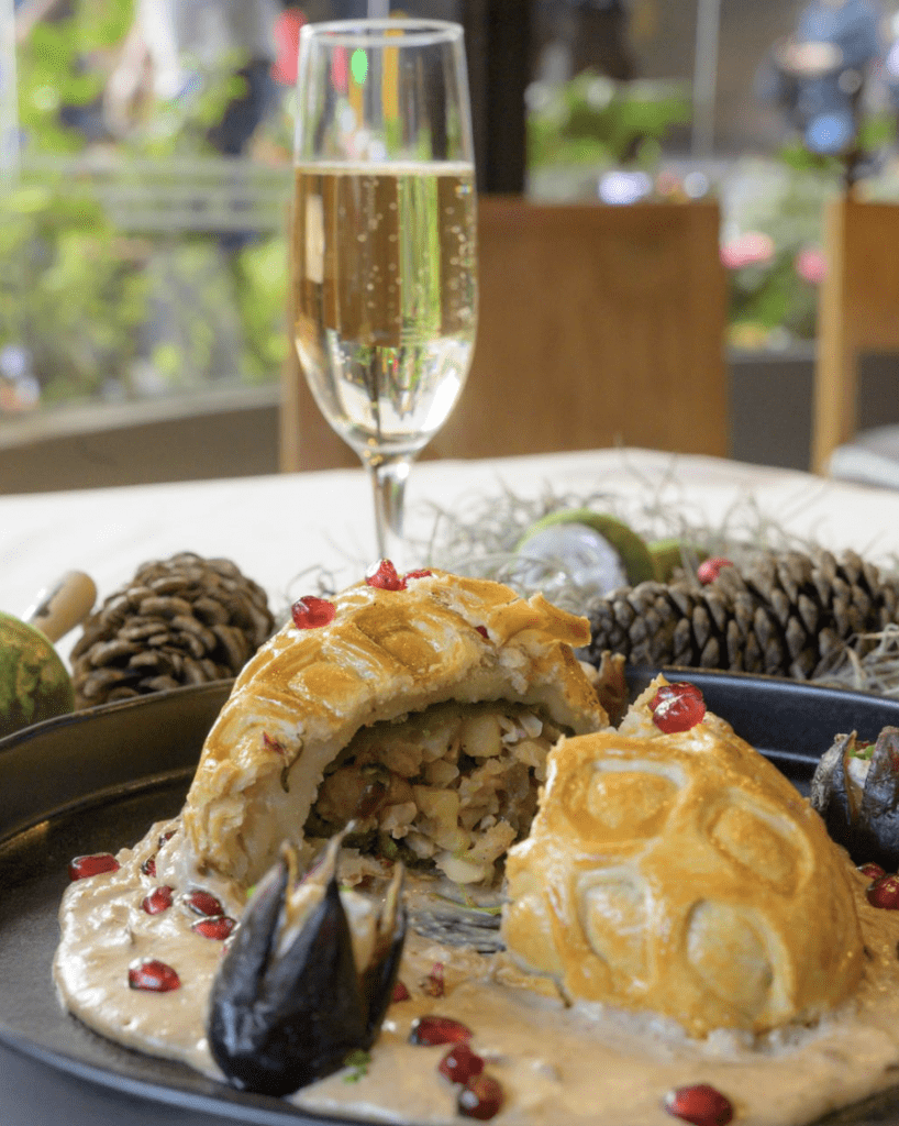 Entre las joyas del menú aparece el chile relleno de pavo, hojaldrado sobre salsa de nuez de castilla. Es, literalmente, una obra de arte en el plato: crujiente por fuera, jugoso por dentro, con un hojaldre que abraza el relleno y una salsa de nuez de castilla que aporta cremosidad, elegancia y un eco sutil a sabores tipo nogada, pero en clave decembrina. Es de esos platillos que se comen primero con los ojos.