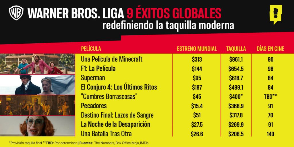 Con «Cumbres Borrascosas» como noveno título consecutivo en la cima global, Warner logra algo sin precedentes en la era moderna: nueve estrenos seguidos dominando el primer fin de semana mundial.